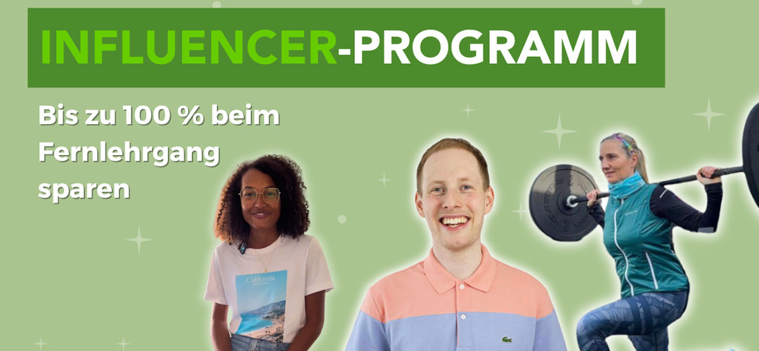 Mit unserem Influencer Programm möchten wir Ihnen die Möglichkeit anbieten, bei uns einen Fernlehrgang zu belegen und darüber auf Ihren Social-Media-Kanälen zu berichten. Den Fernlehrgang können Sie dann entweder vollständig kostenfrei absolvieren oder zu stark reduzierten Konditionen teilnehmen.